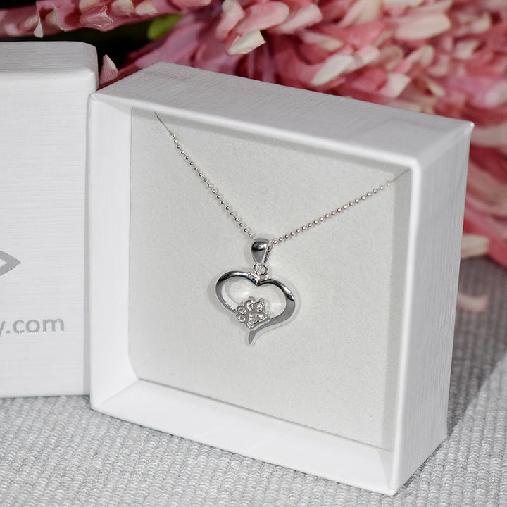 Offset overlapped silver heart with cubic zirconia pawprint pendant