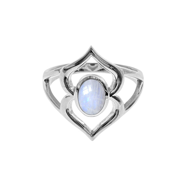 Silver abstract design ring with oval rainbow moonstone