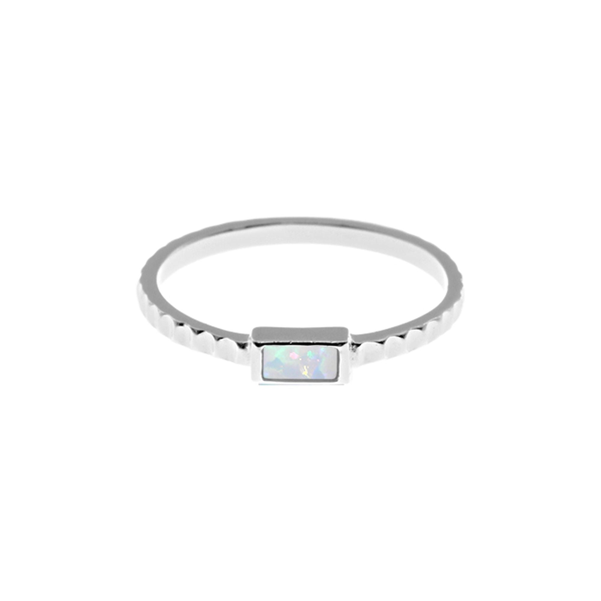 Rectangle white opalique ring with ridged silver shank