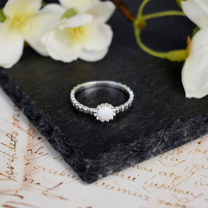 Bethan crimped band with round white opalique ring