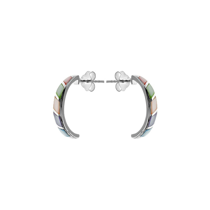 Multi-coloured diagonal mother of pearl and silver stud topped hoops