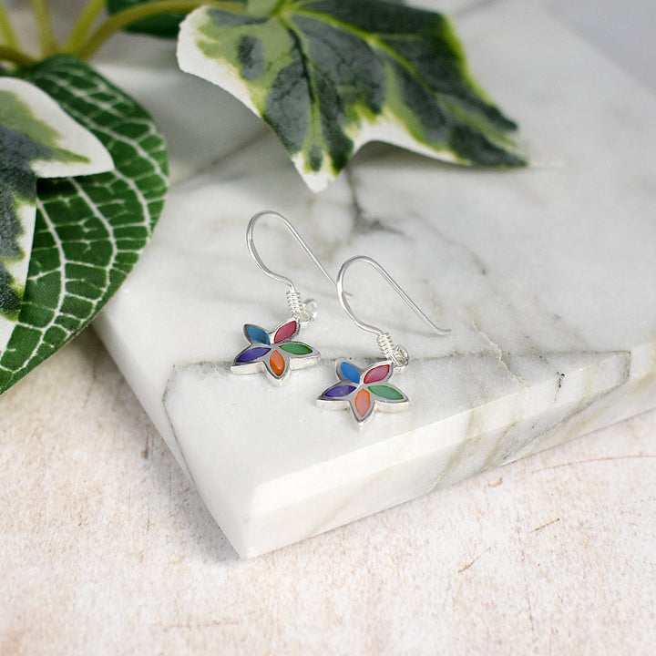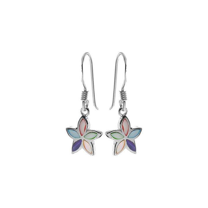 Multi-coloured mother of pearl and silver marquis petal flower earrings