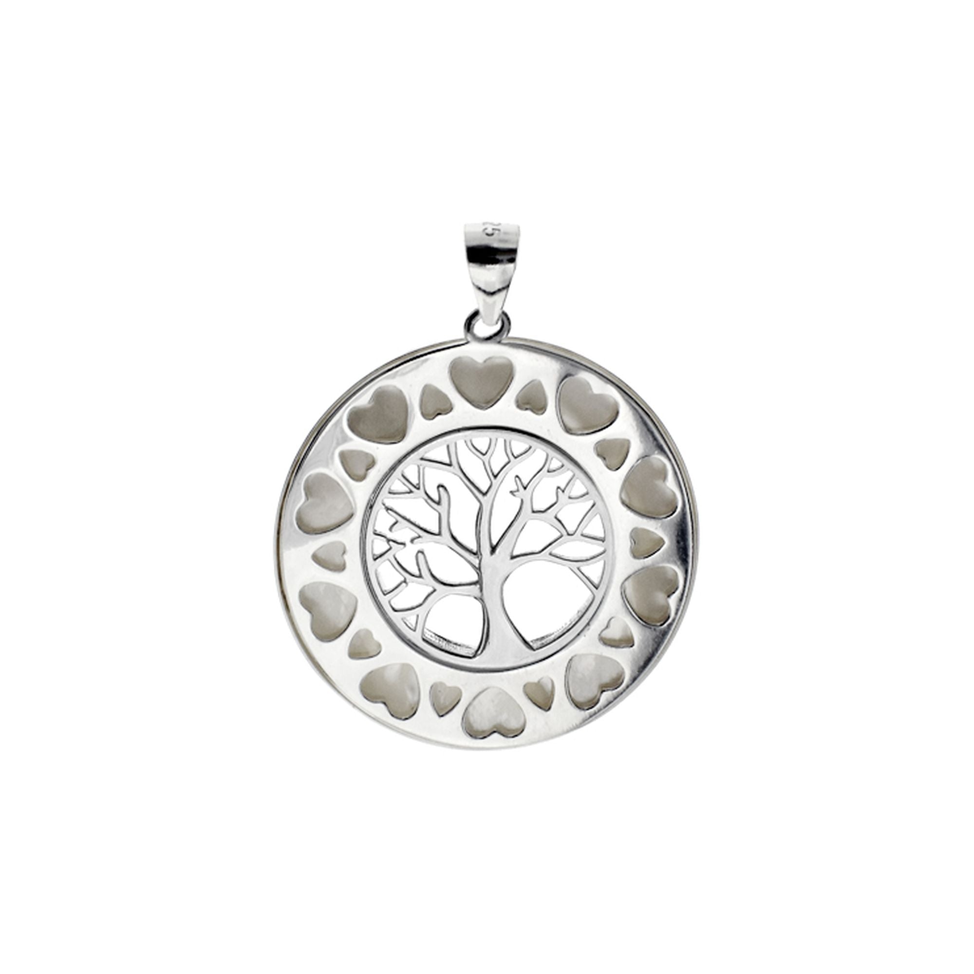 Reversible mother of pearl pendant with tree of life centre and heart detail on one side