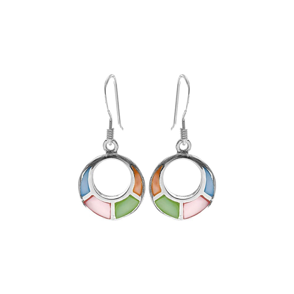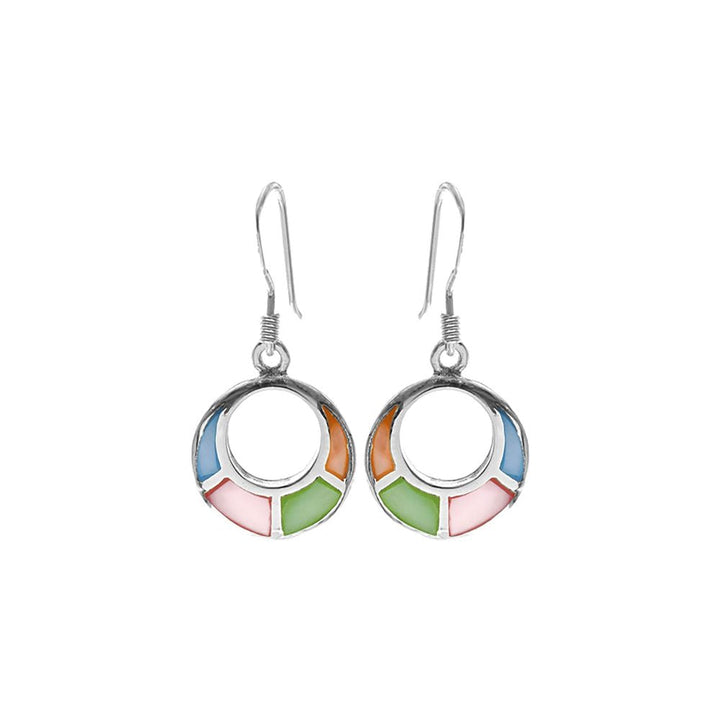 Tapered ring sectioned multi-coloured mother of pearl and silver earrings
