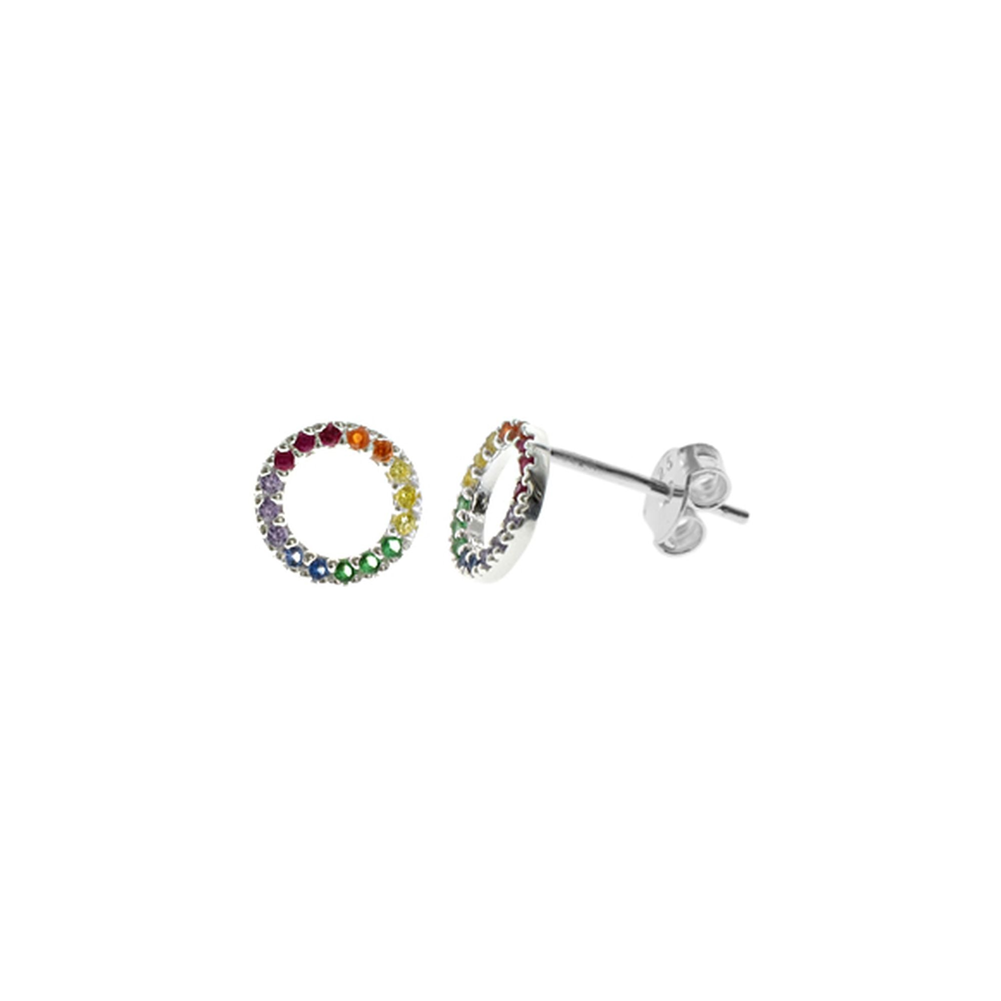 Silver 8mm diameter open circle studs set with rainbow cubic zirconia