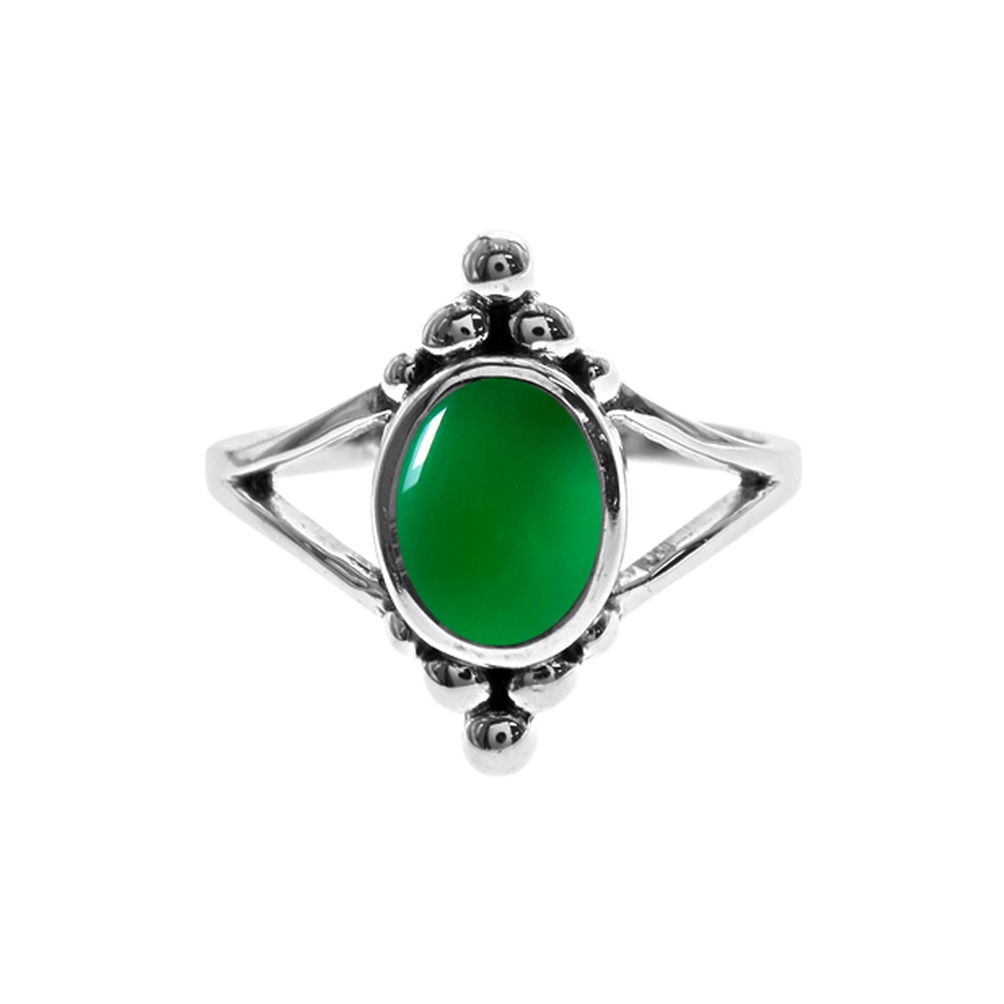 Silver and green agate split band ring with bead detail