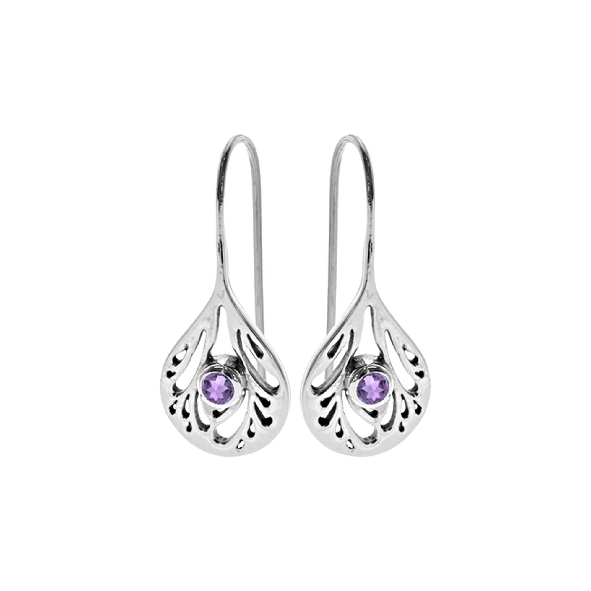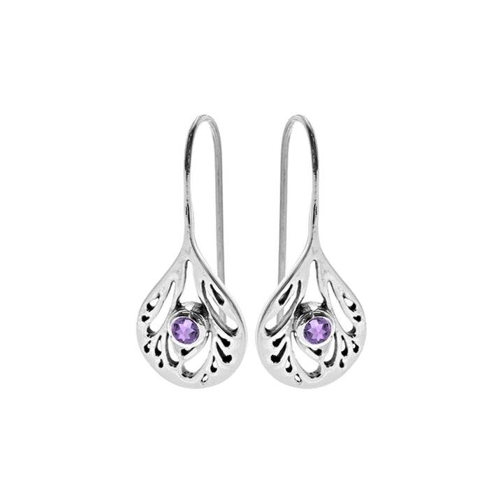 Bulb shape fixed hook silver and amethyst earrings with flower pattern