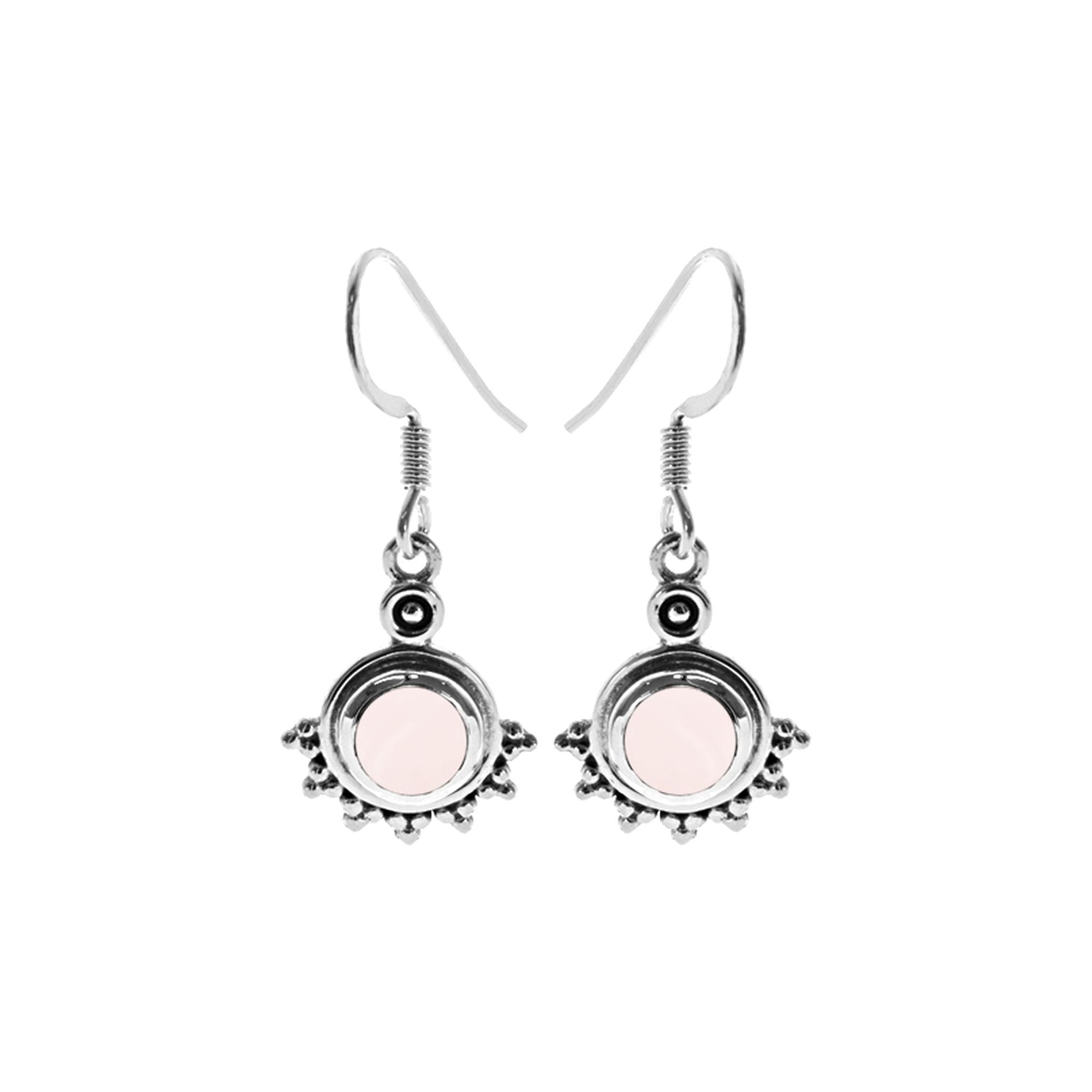 Small round rose quartz and silver earrings with half surround oxidised bobble detail