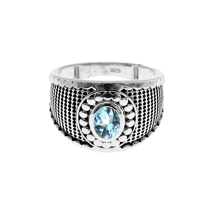 Wide bobble flat bobble pattern silver ring with faceted blue topaz