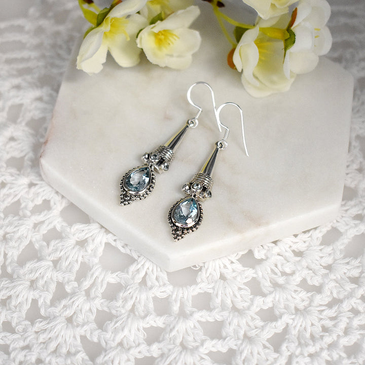 Oxidised silver teardrop blue topaz facet earrings