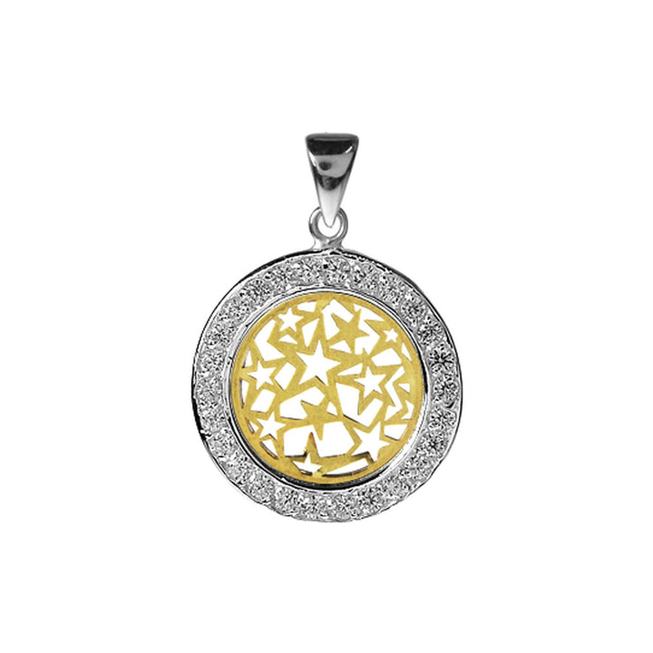 Decorative silver disc pendant set with yellow gold and cubic zirconia