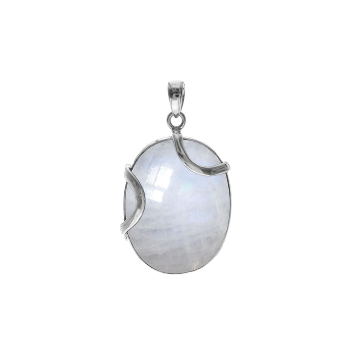 Elongated large oval rainbow moonstone pendant with silver overlay