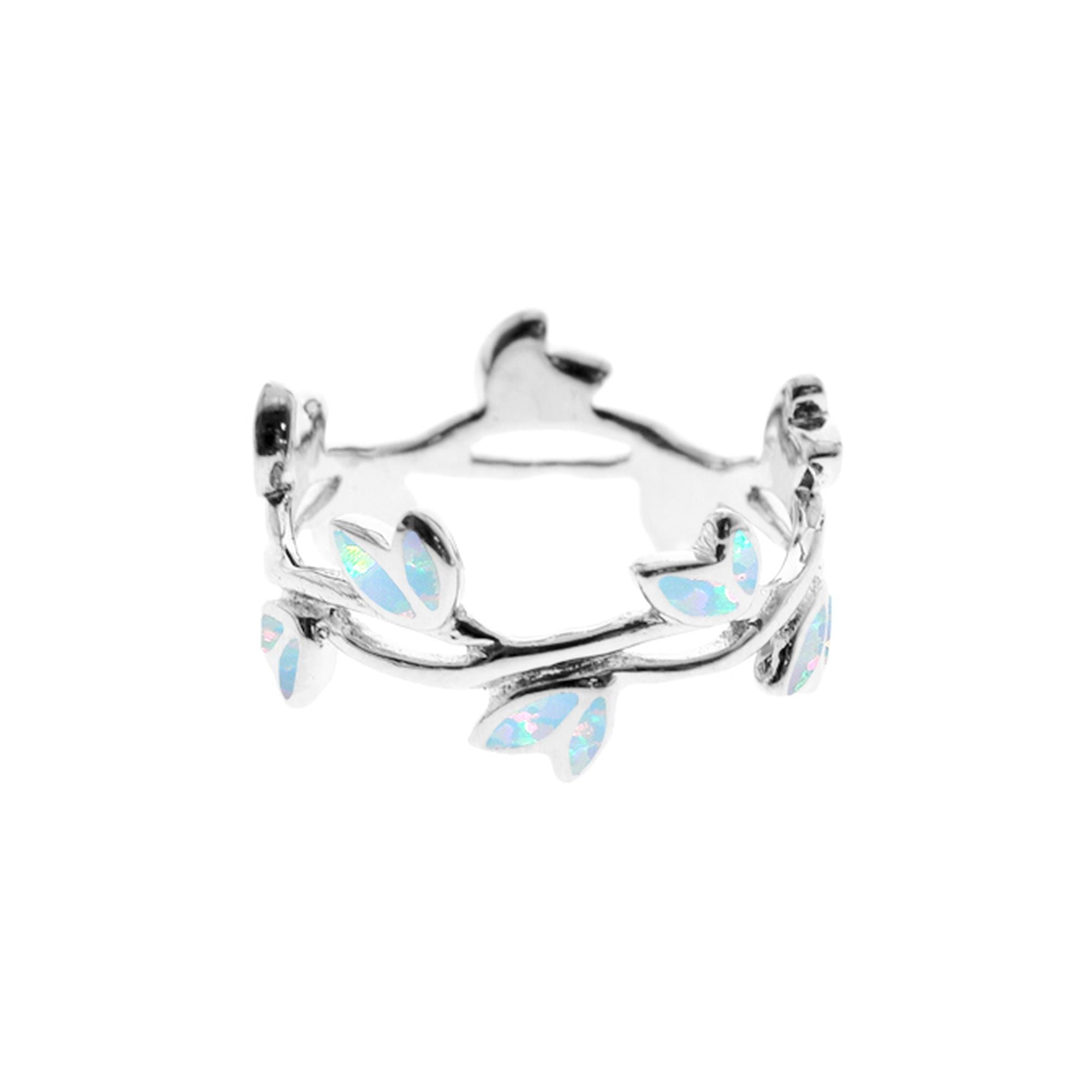 Entwined sprig design white opalique and silver band ring