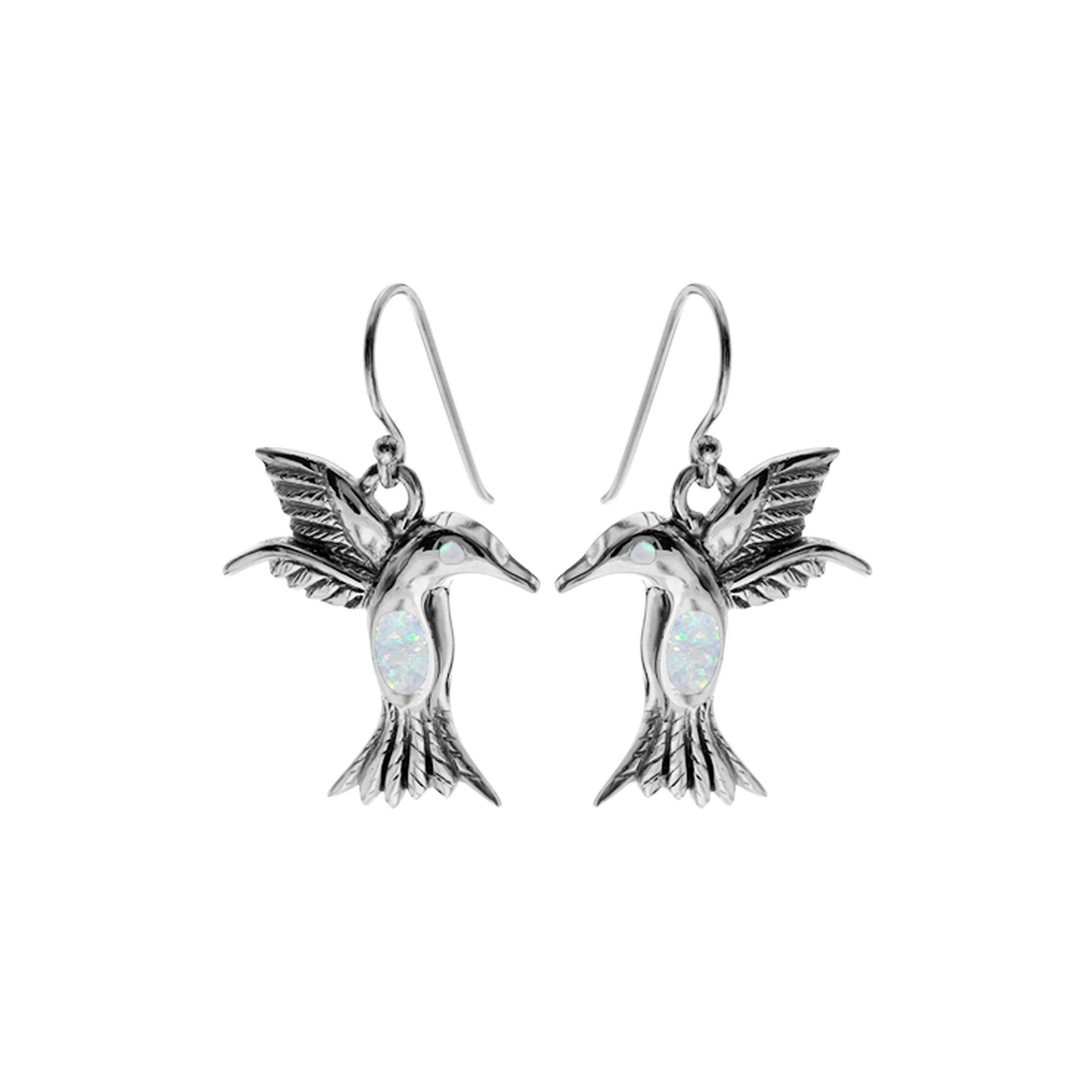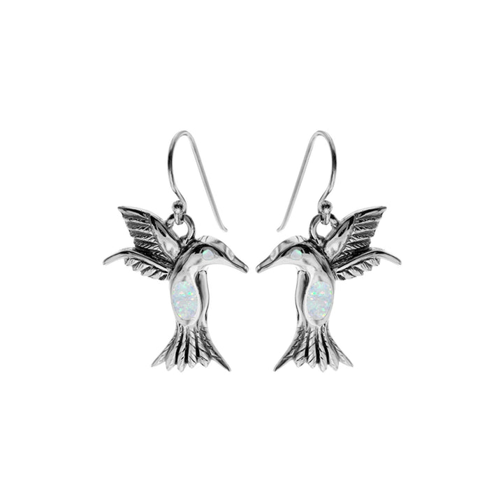 White opalique and silver hummingbird earrings
