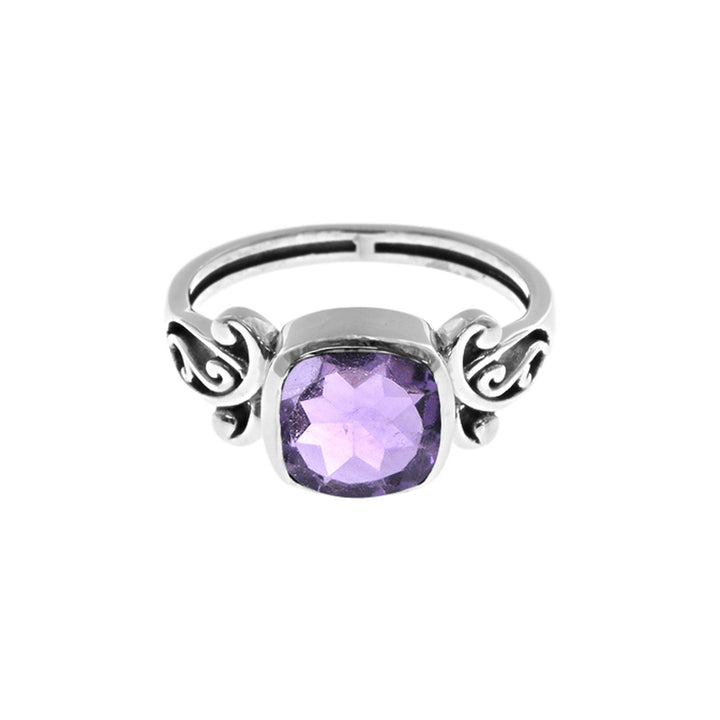 Cushion faceted amethyst and silver ring with scroll detail shoulders