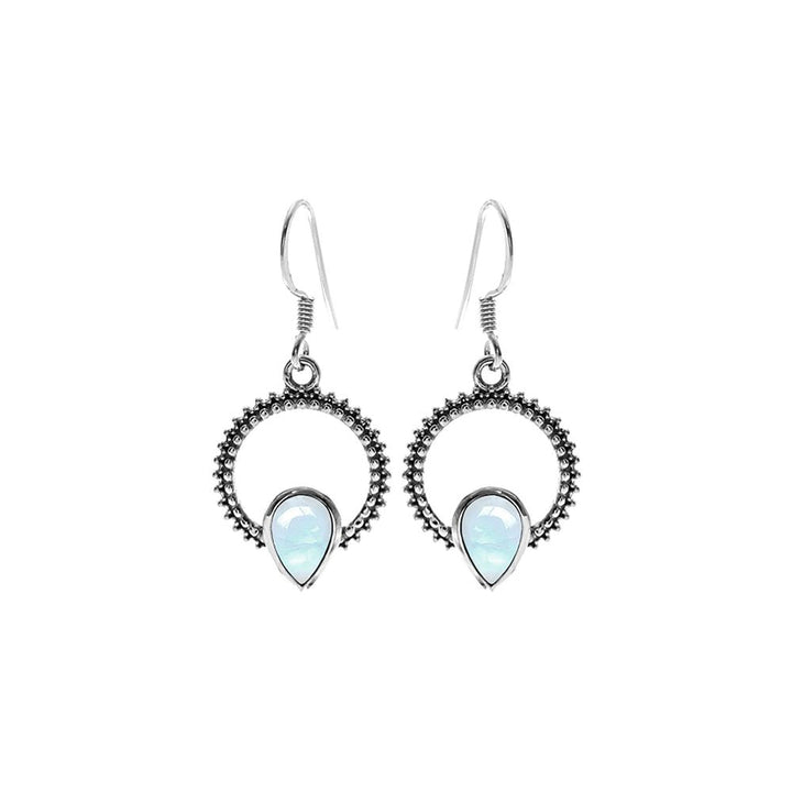 Teardrop rainbow moonstone set in textured silver loop earrings