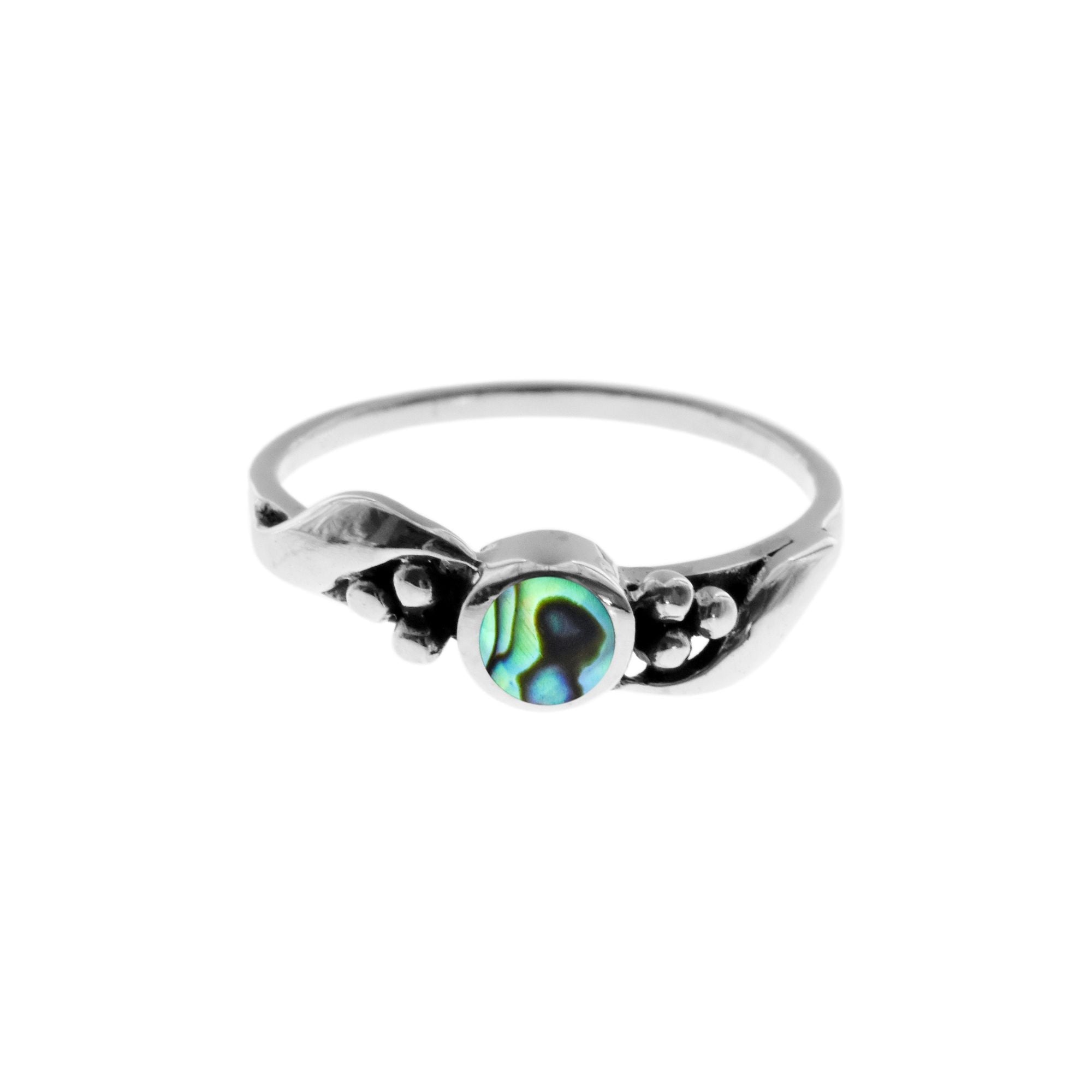 Paua shell and silver ring with leaf and bud design