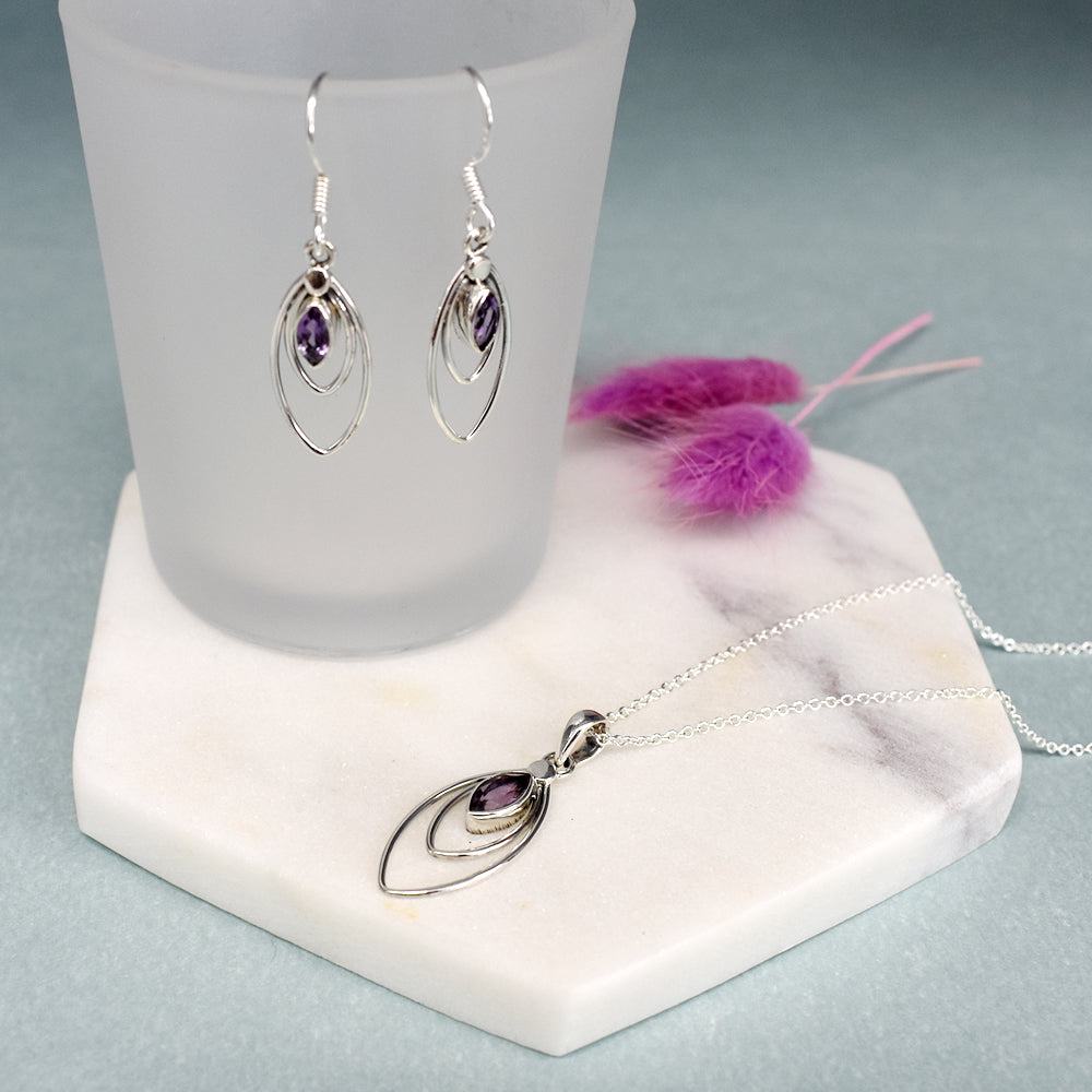 Double marquis framed faceted amethyst and silver pendant