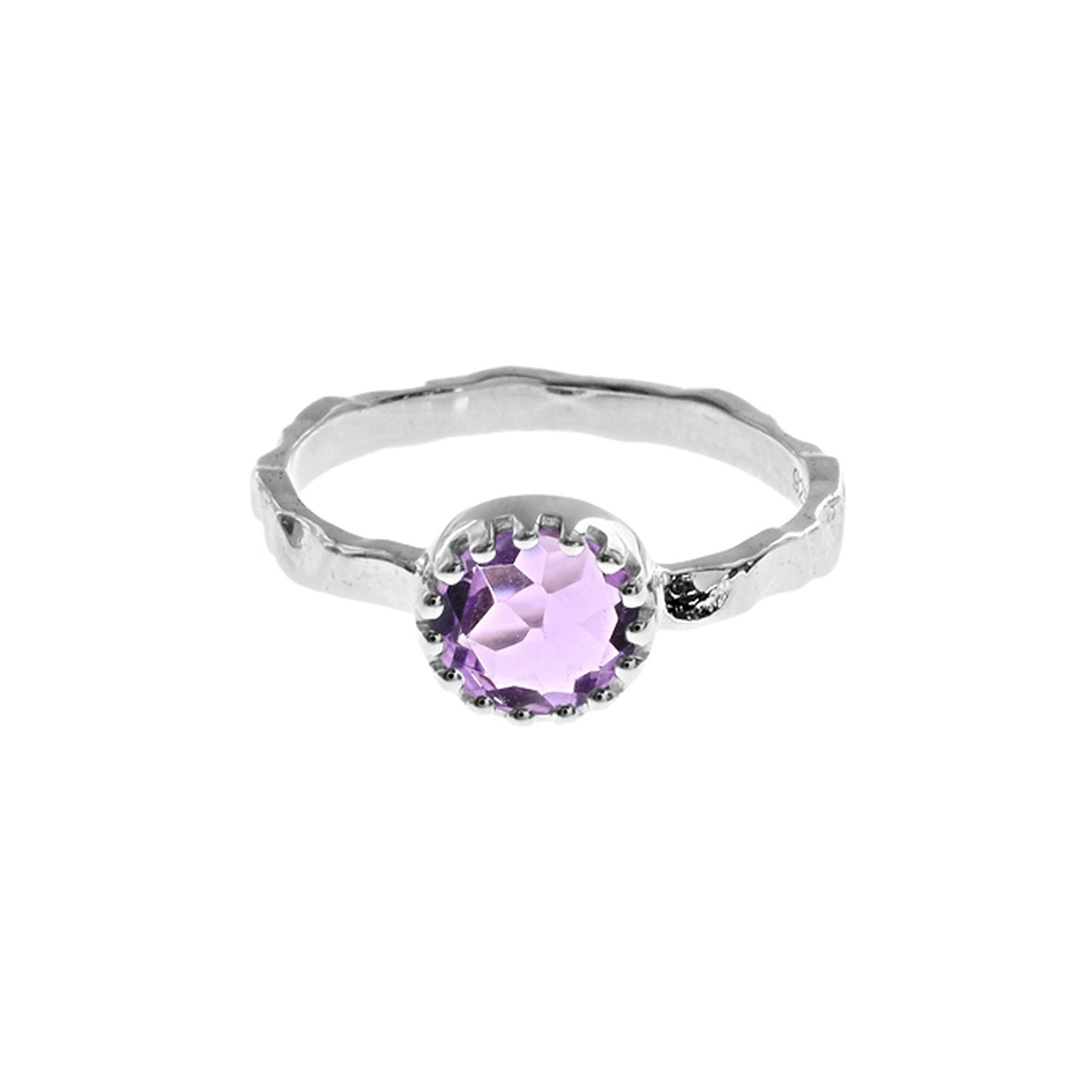 Silver textured band ring with claw-set faceted amethyst