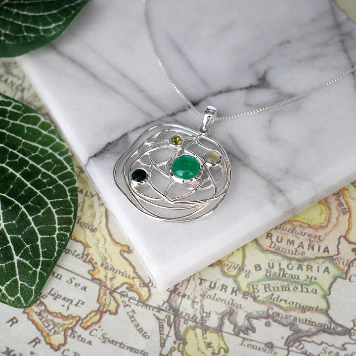 Green agate, emerald quartz, prehnite and peridot silver wire pendant