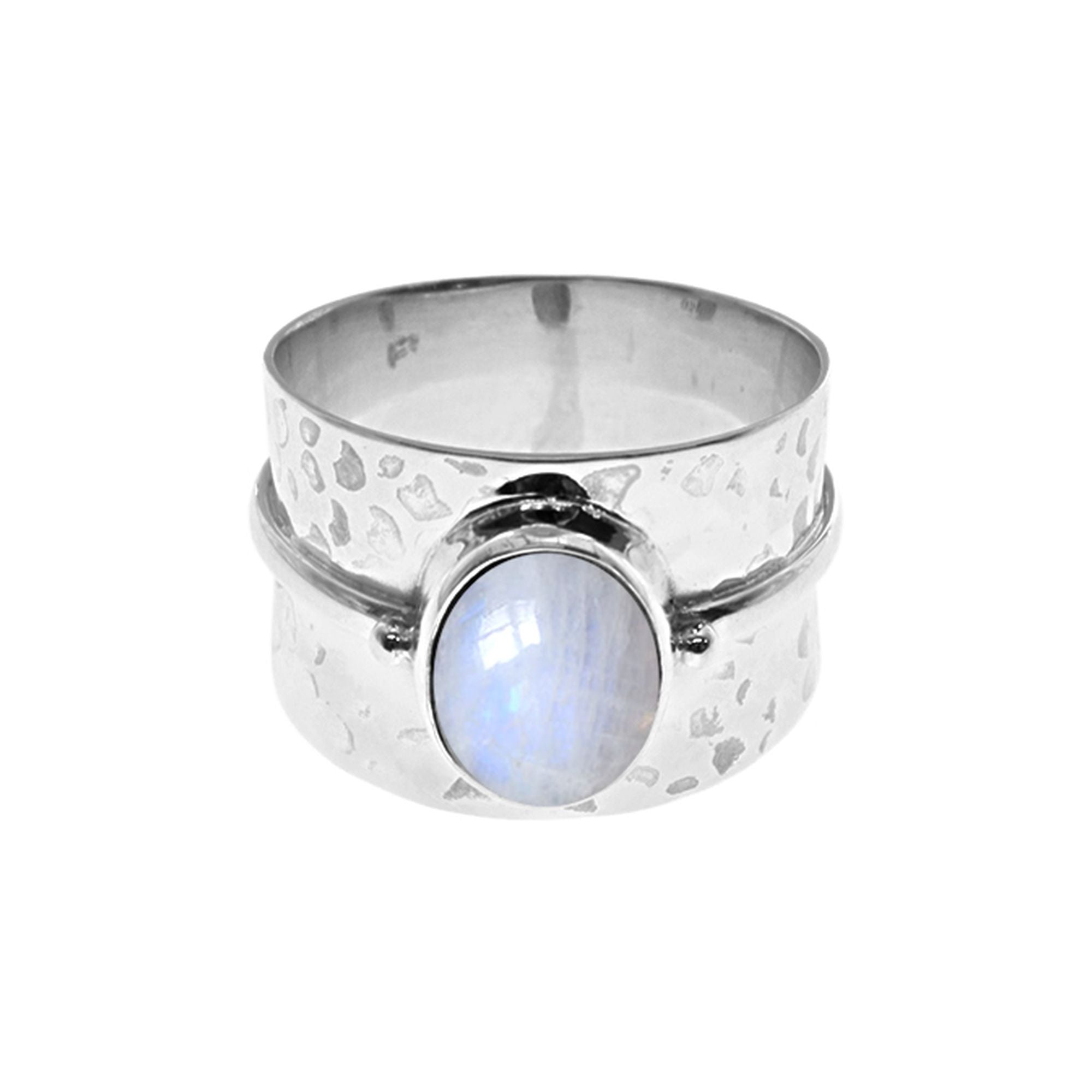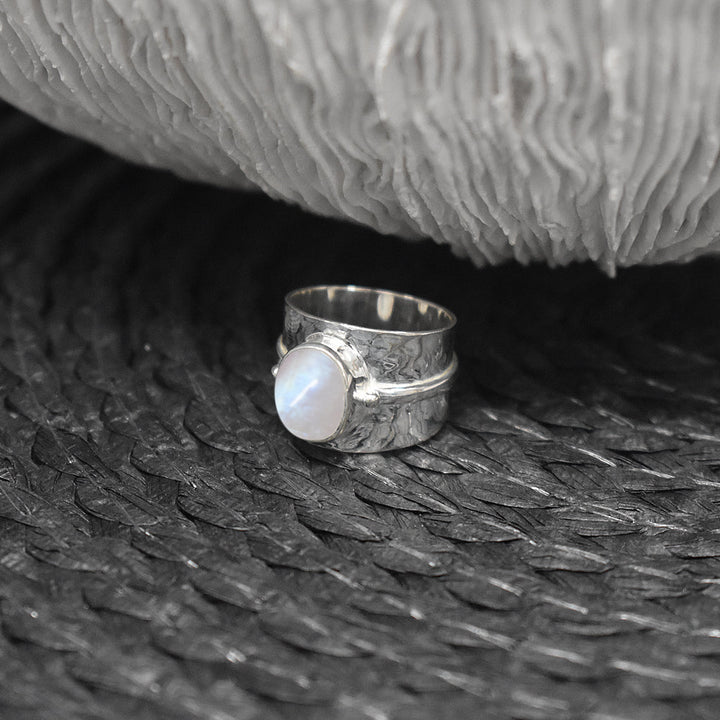Hammered tapered band with oval rainbow moonstone ring