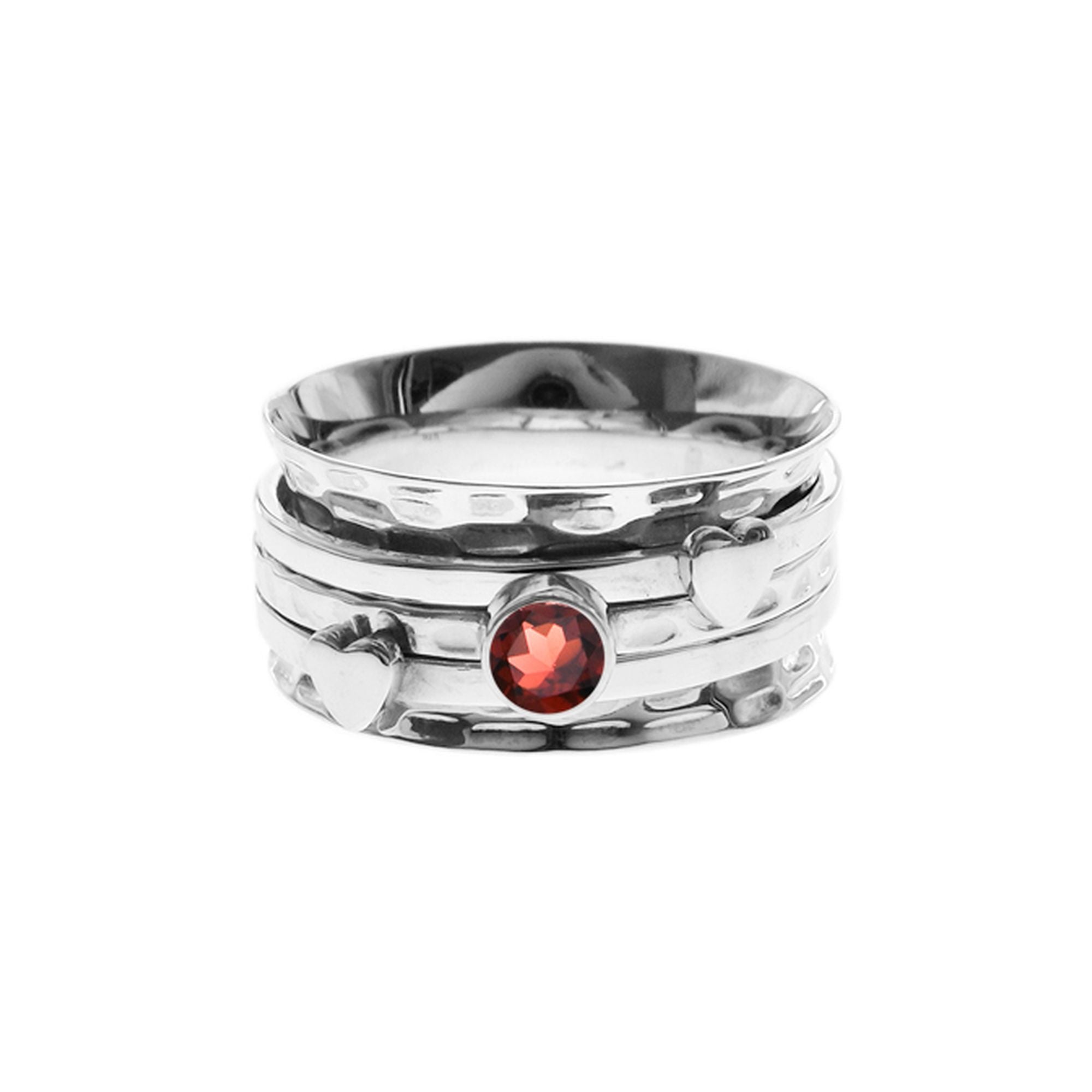Triple band spinning ring with hearts and faceted garnet