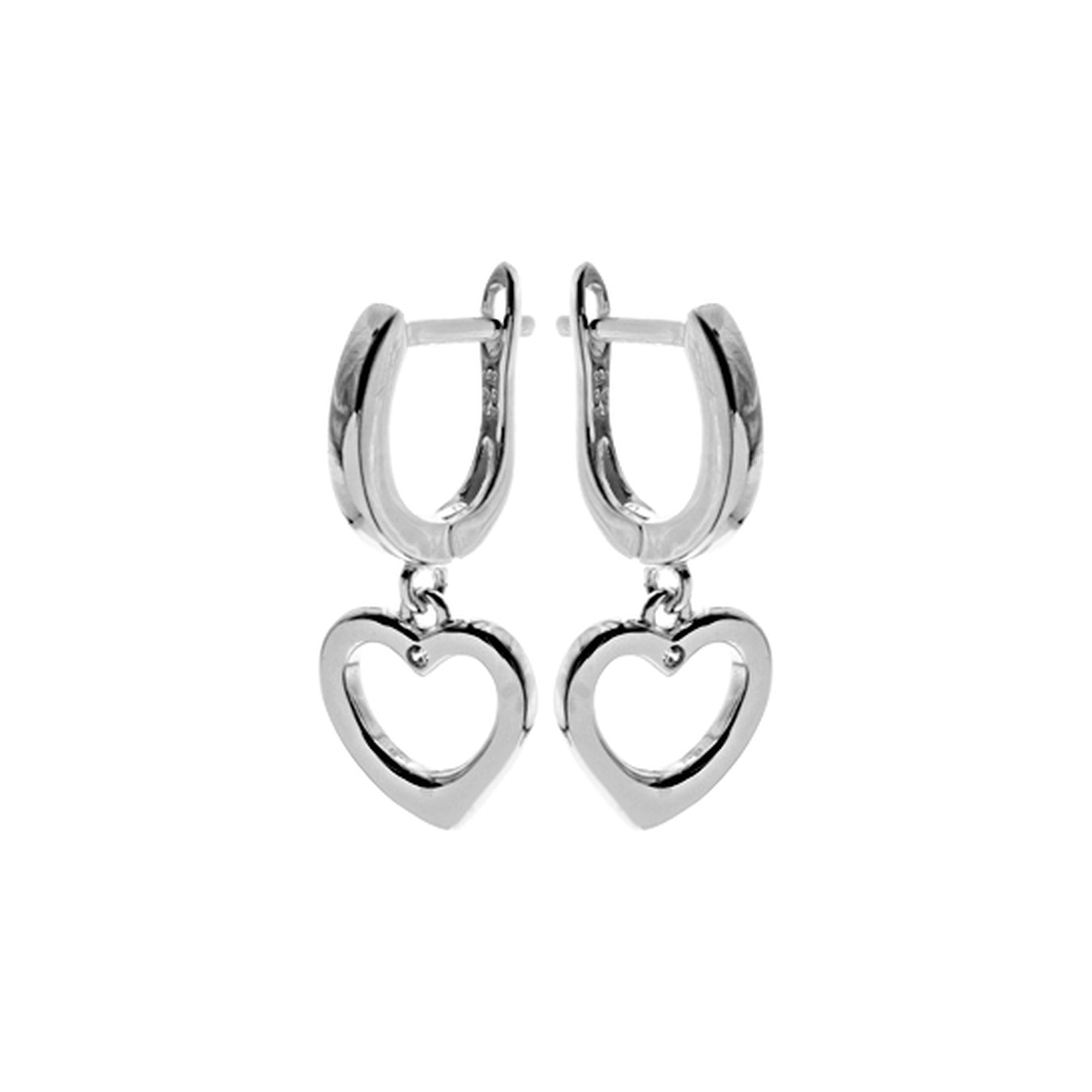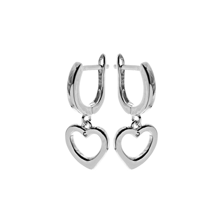 Sterling silver huggie hoops with open heart shaped charm and tiny cubic zirconia