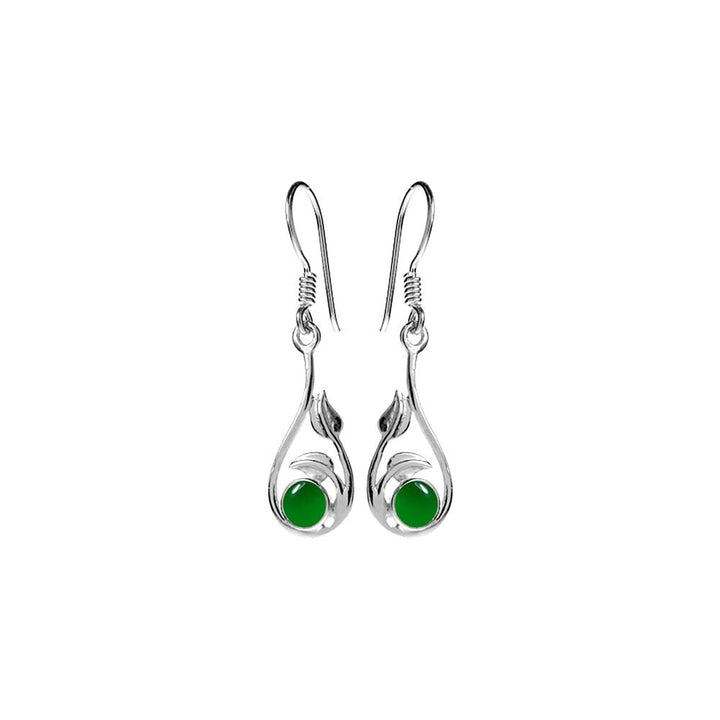 Round green agate stone encircled by silver leaf earrings