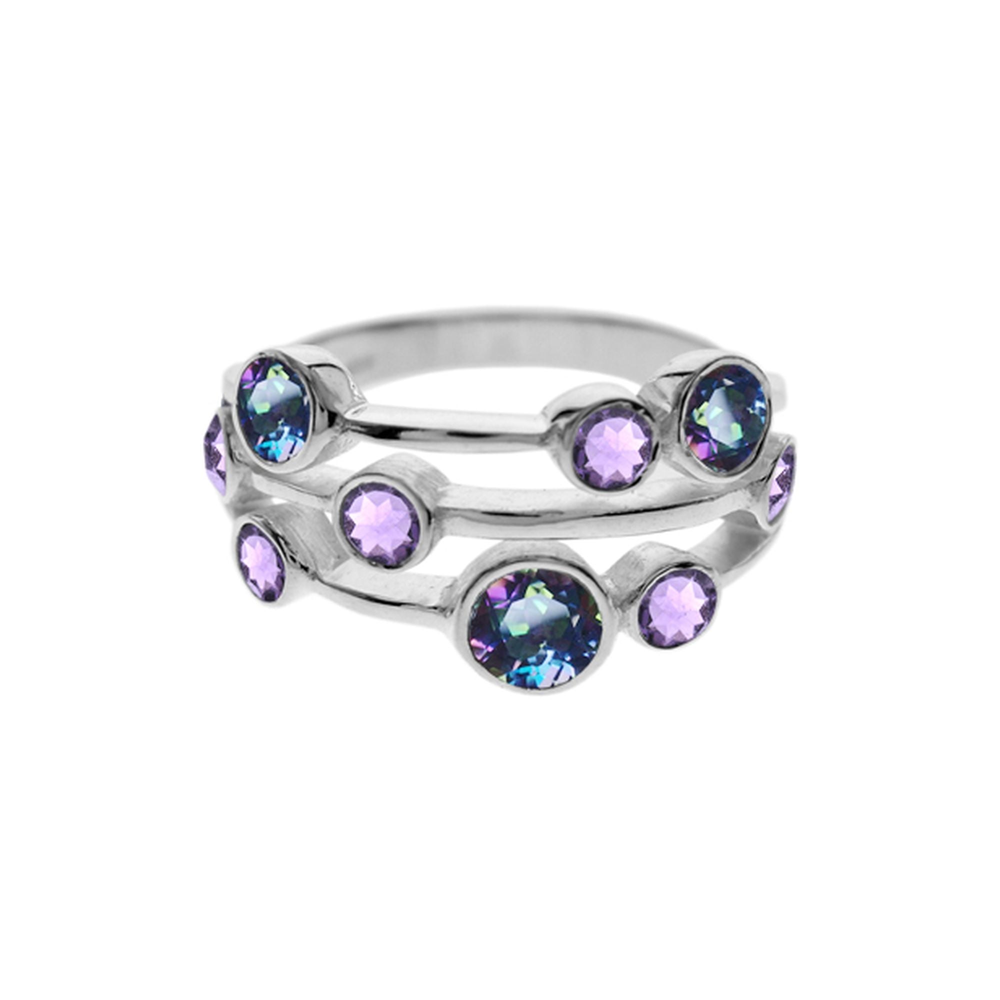 Silver nine stone amethyst and mystic topaz ring