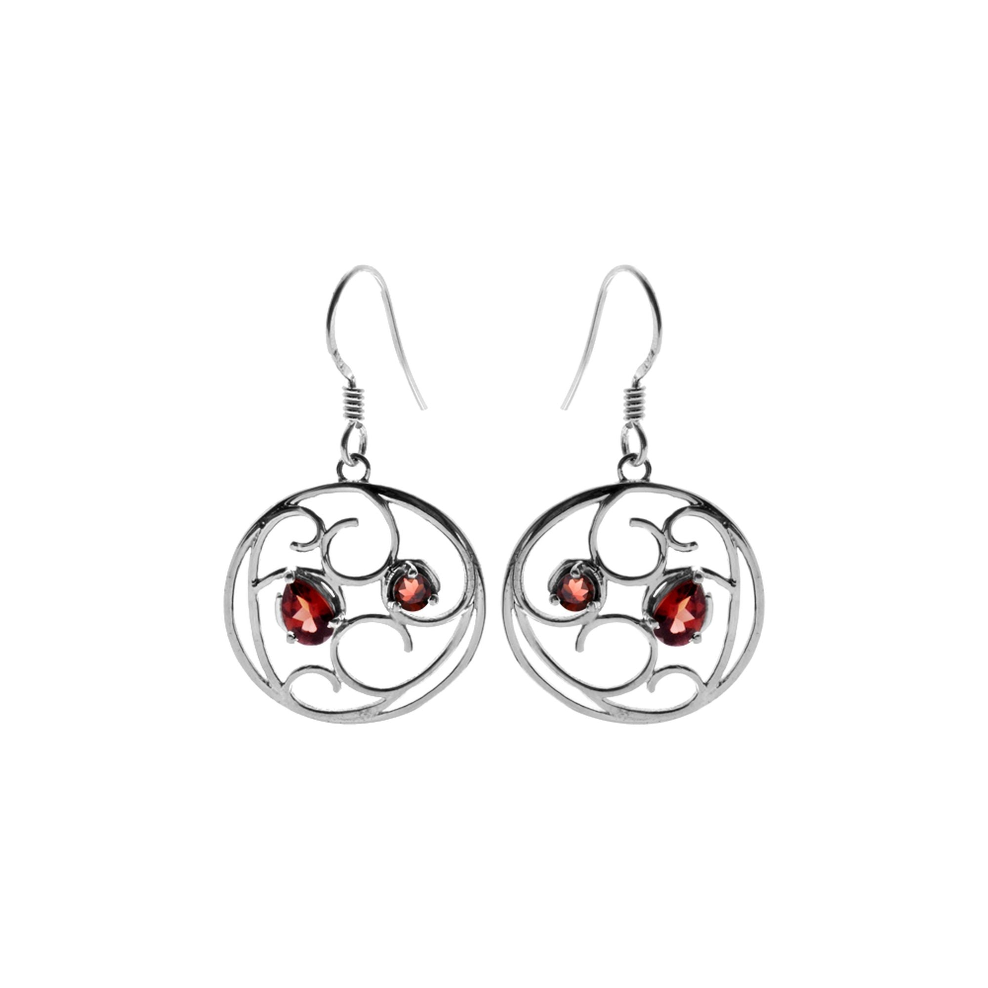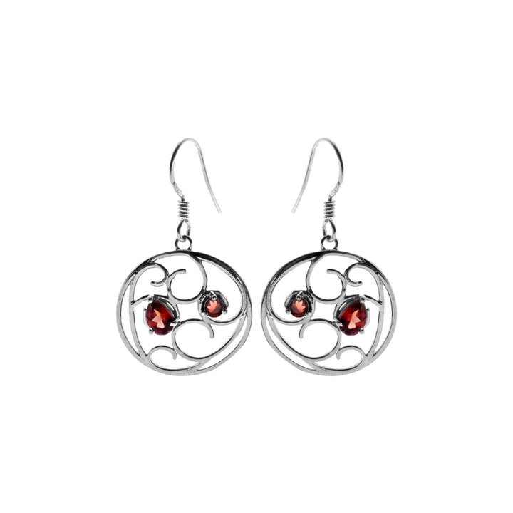 Round floral swirl silver earrings with teardrop and round faceted garnet