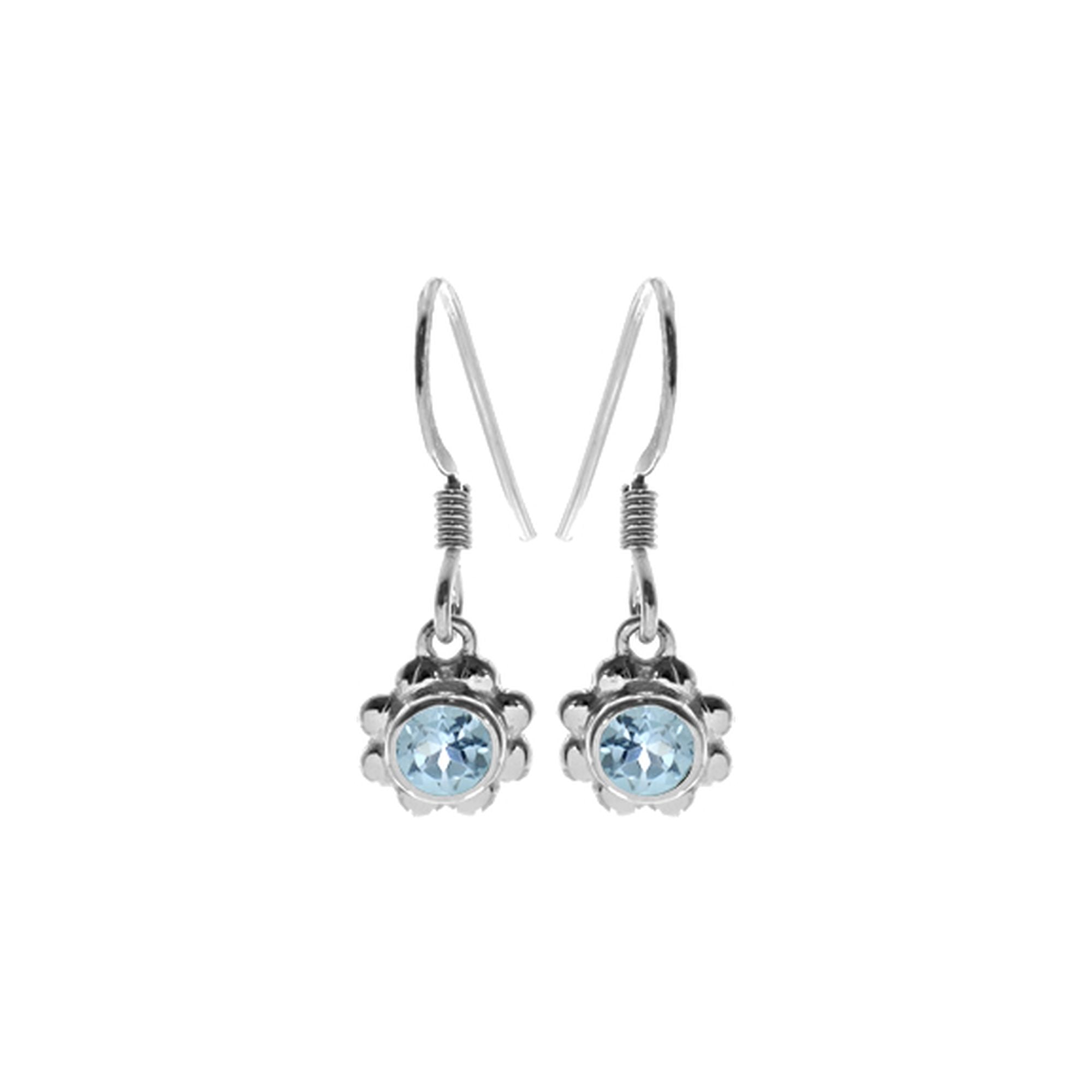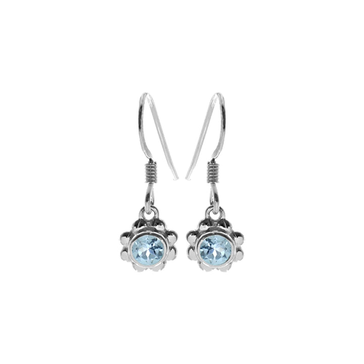 Mini blue topaz and silver drop earrings with petal surround