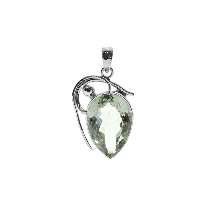 Rounded teardrop shaped faceted green amethyst pendant with fancy wire detail