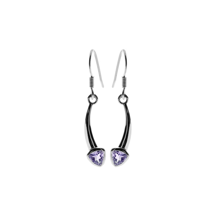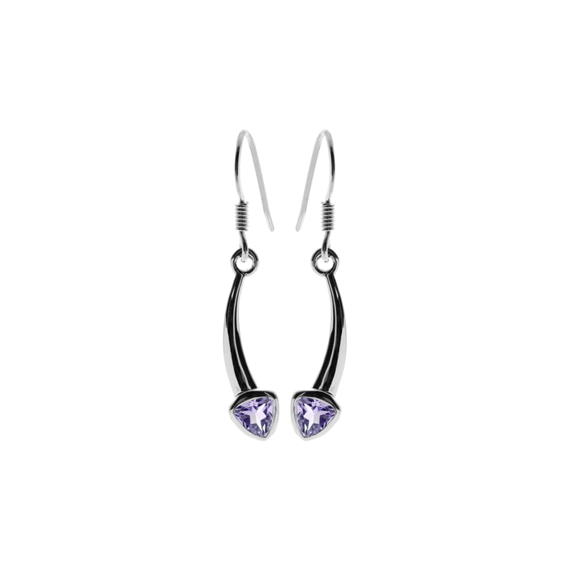 Curved arrow silver earrings with faceted amethyst