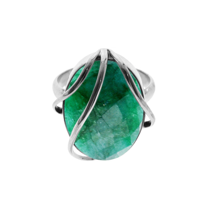 Oval emerald quartz ring with 3 overlaid bands of silver
