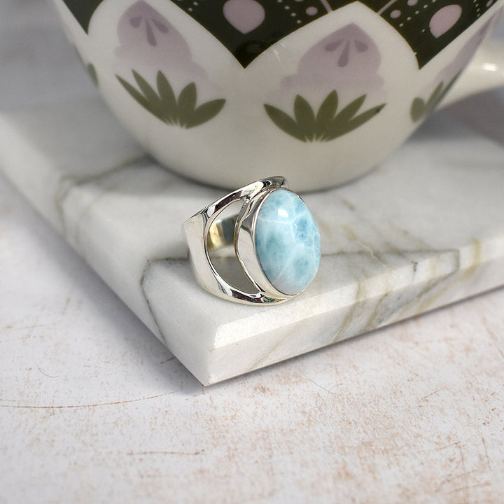 Large oval larimar ring with wide cut out band