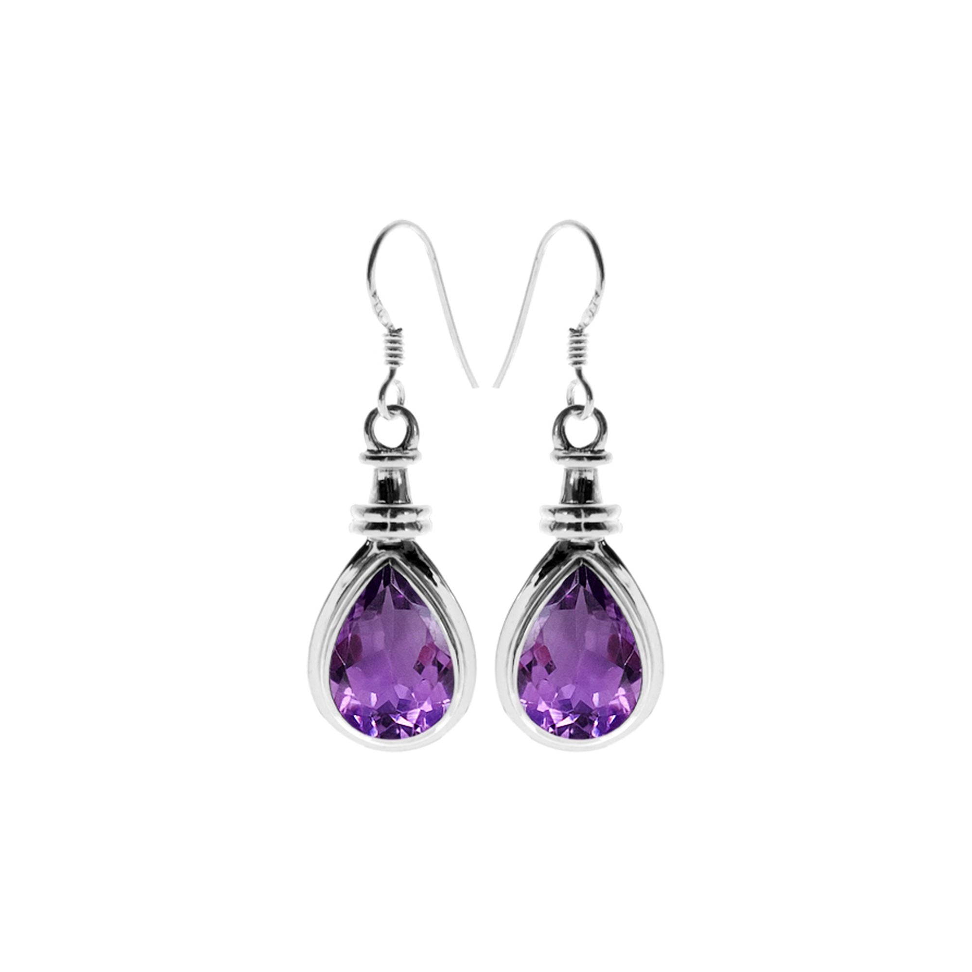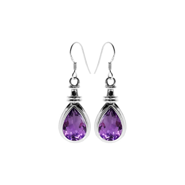 Faceted amethyst teardrop in a wide collet setting with neck detailing