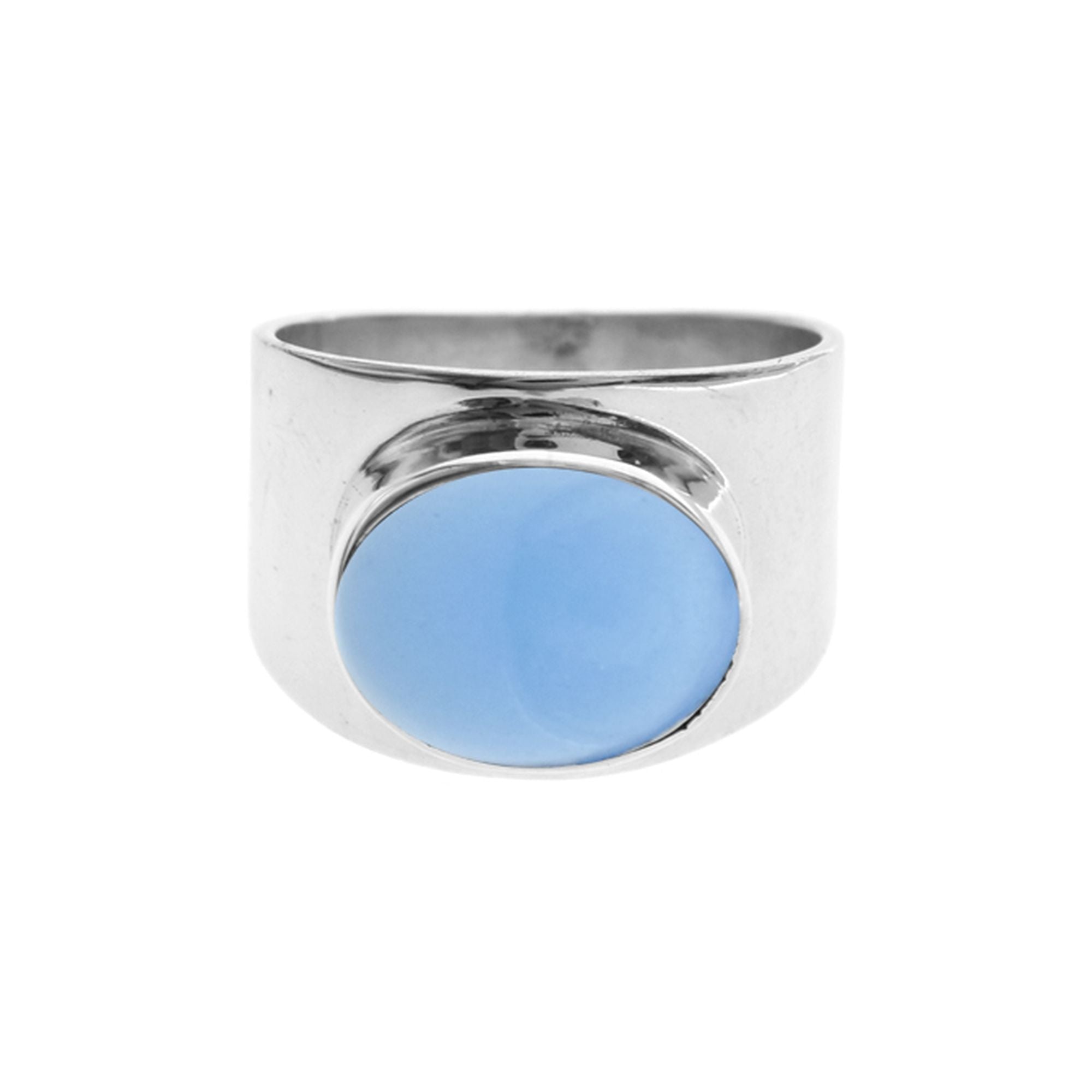 Wide plain silver band ring set with blue chalcedony