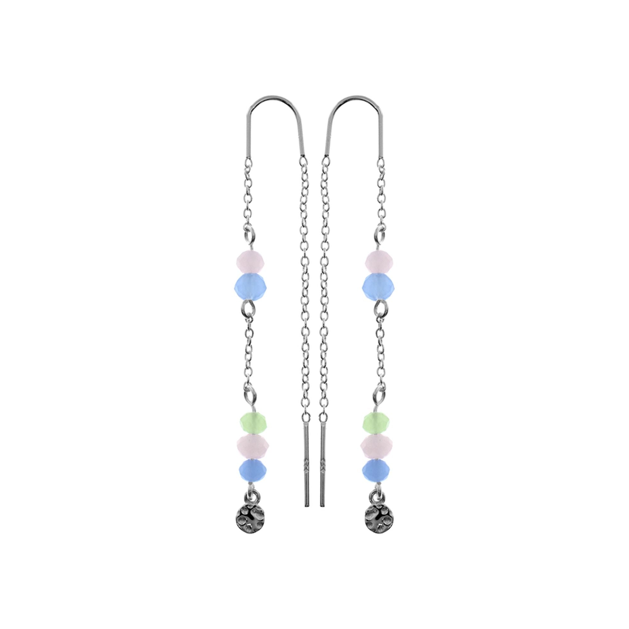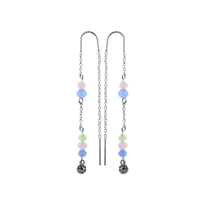 Multi coloured faceted stones pull through silver chain earrings with hammered disk