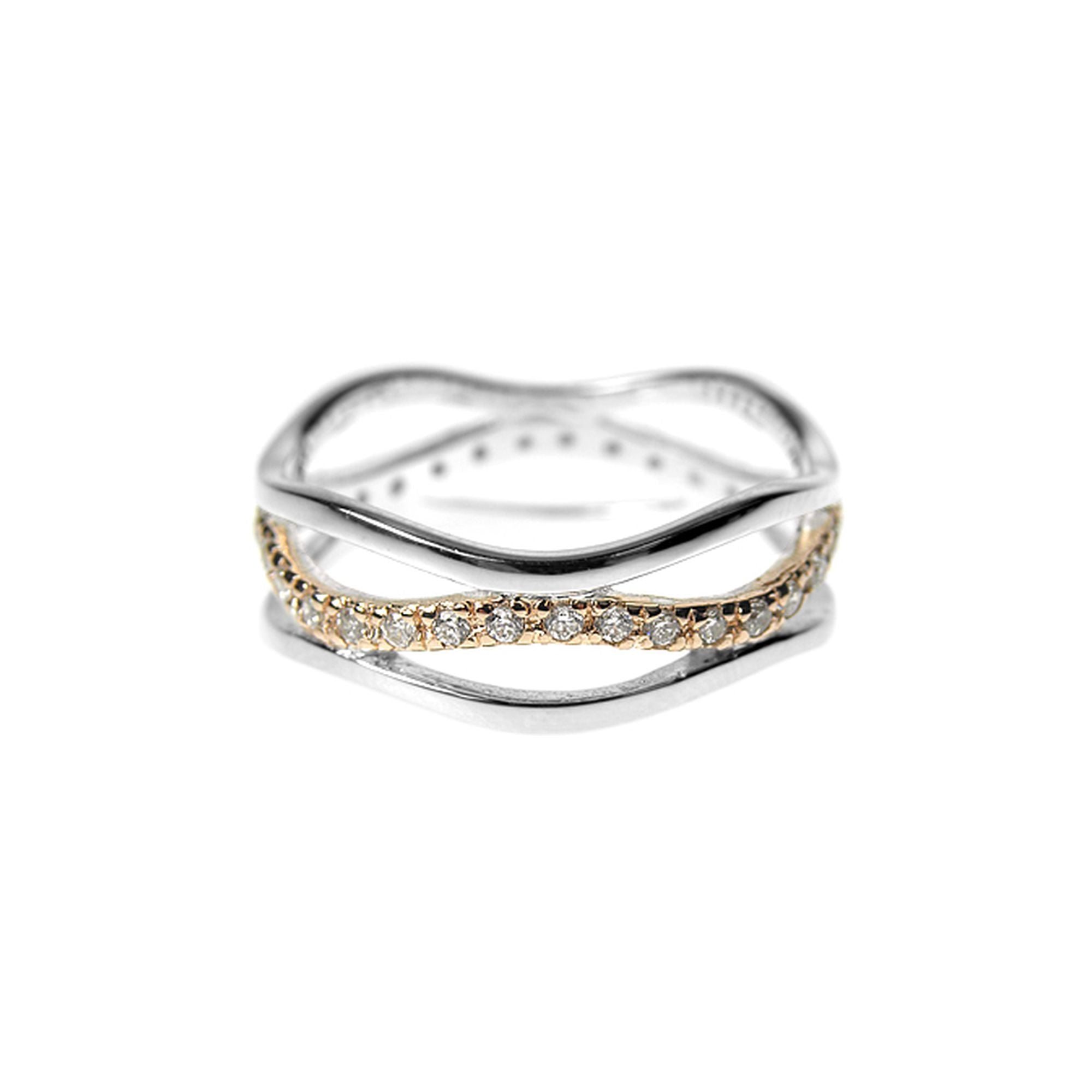 Silver waved band ring with rose vermeil and studded cubic zirconia